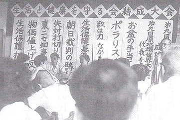 | 1966年 | 自治体共闘会議の区交渉に参加、南京虫をビンに入れて持ち込み、殺虫剤を支給させる。 対区交渉して生活保護費の4月分を入学前に支給。 都生連第4回総会で500世帯達成の「拡大賞」を受ける。 「私の要求運動」とりくむ。 |